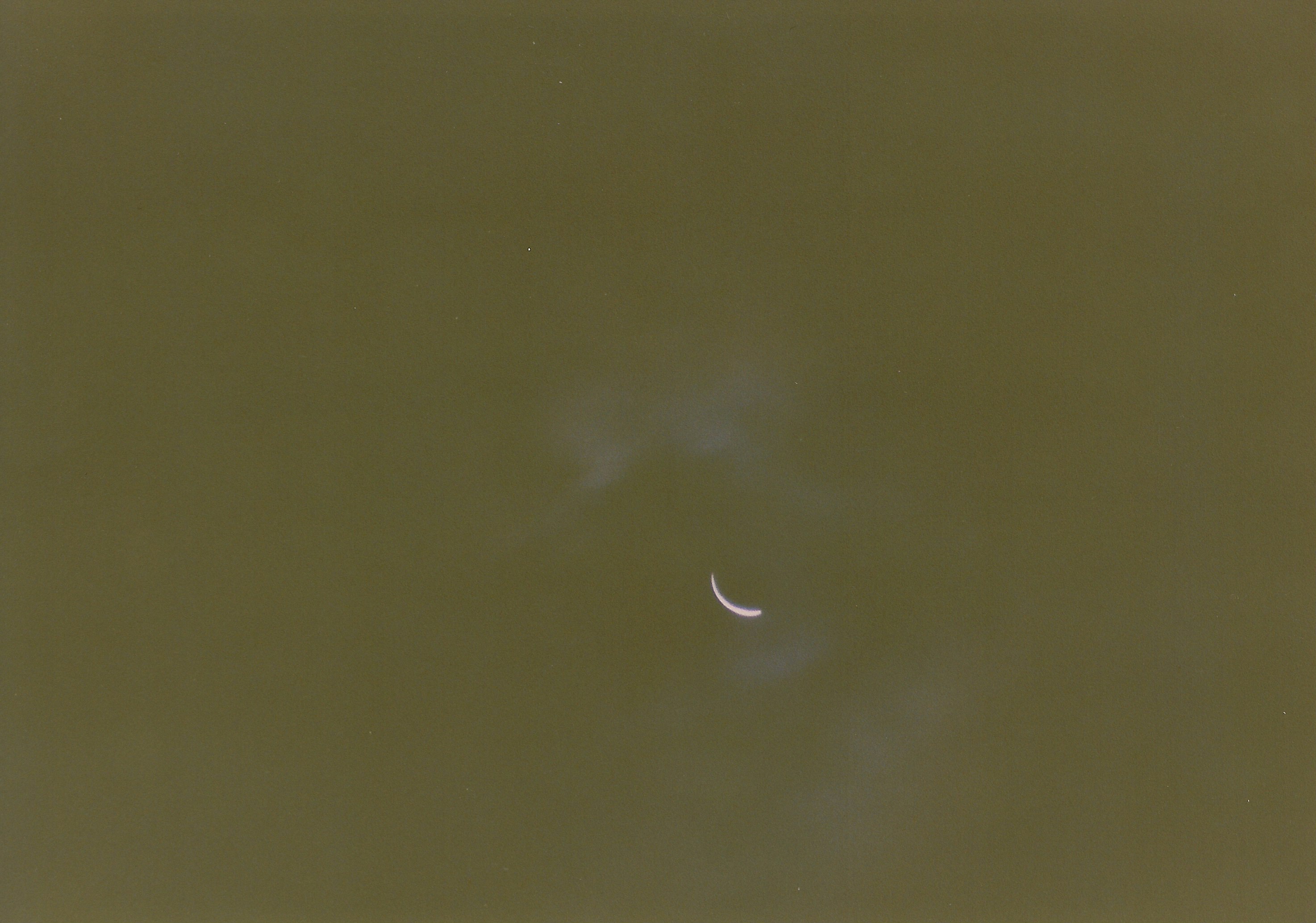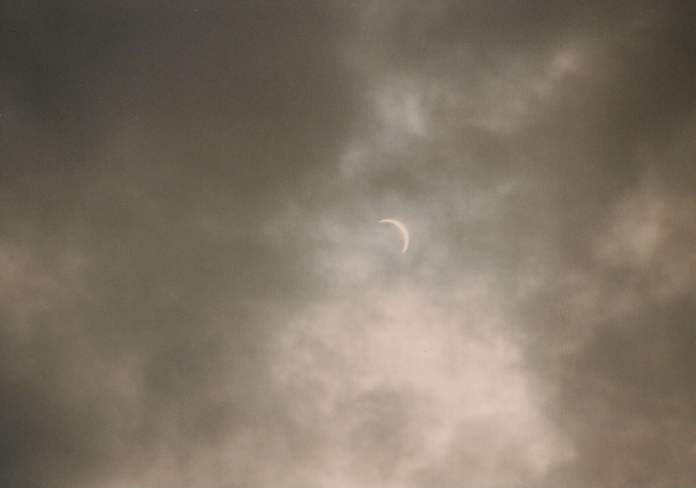 Auf den Bildern der partiellen Phase kann man recht gut die Bewölkungssituation erahnen. Es war quasi eine geschlossene Wolkendecke, jedoch teilweise recht dünne Wolken, durch die die Sonne durchschien. Leider weiß ich es nicht mehr, aber ich nehme an, daß ich die Fotos mit automatischer Belichtung gemacht hatte. Als uns die Totalität erreichte, drückte ich noch einmal schnell den Auslöser. Nach ca. 10 Sekunden verschwand die verfinsterte Sonne hinter einer undurchdringlichen Wolke, wo sie für die nächsten 3 oder 4 Minuten blieb. Nachdem die Wolke die Sonne wieder frei gab machte ich noch ein paar Aufnahmen der partiellen Phase und wir machen uns wieder auf den Rückweg nach Koblenz.