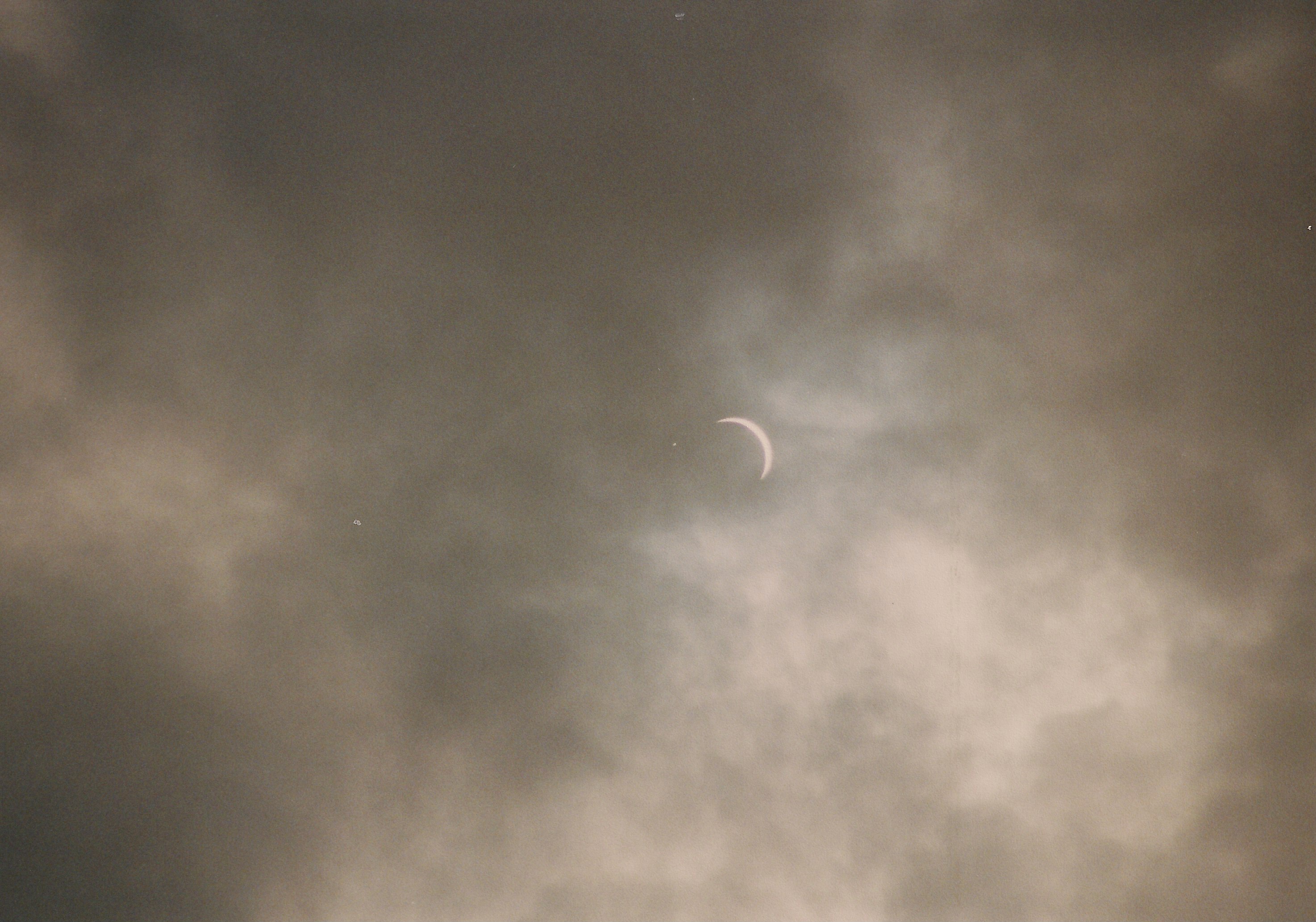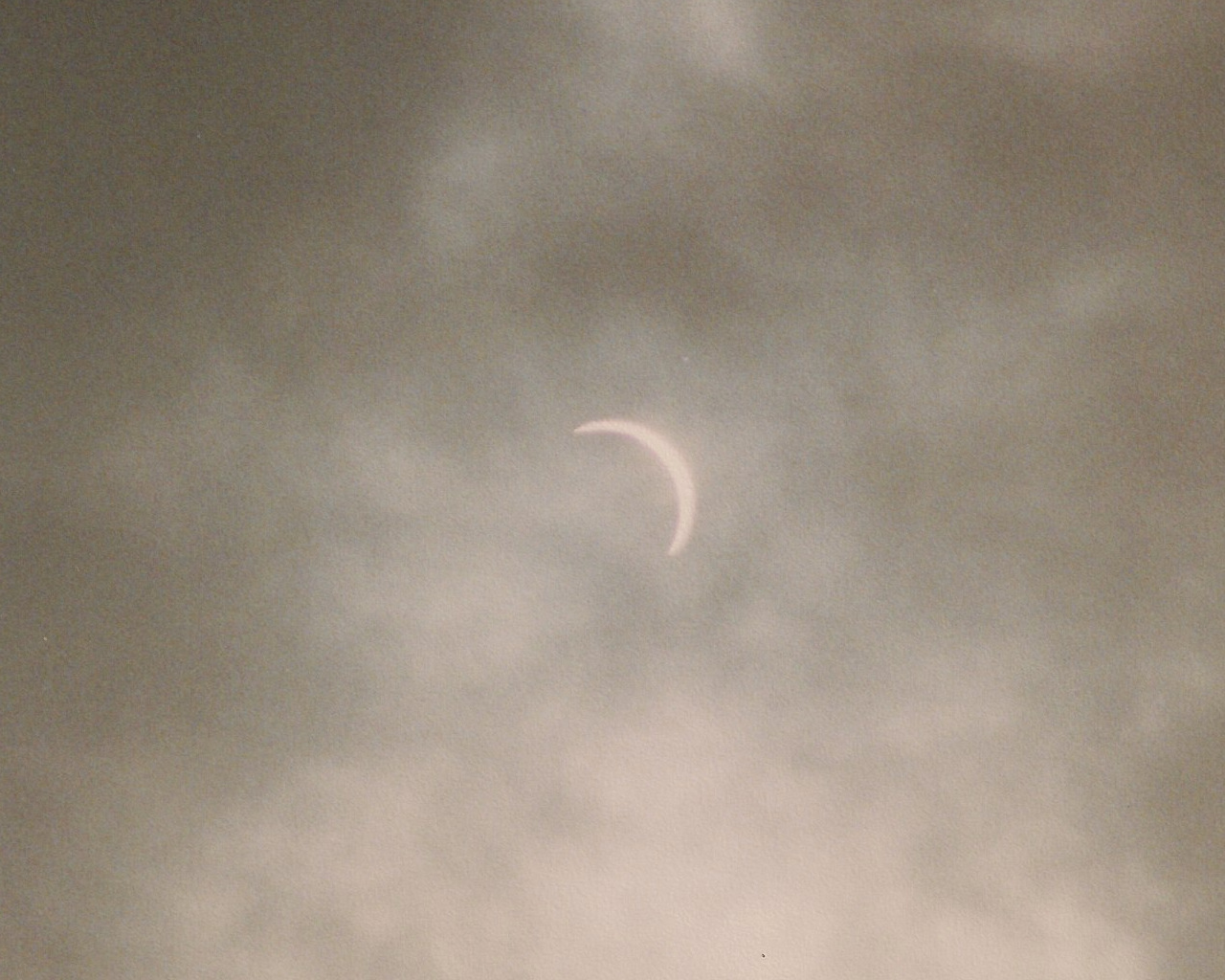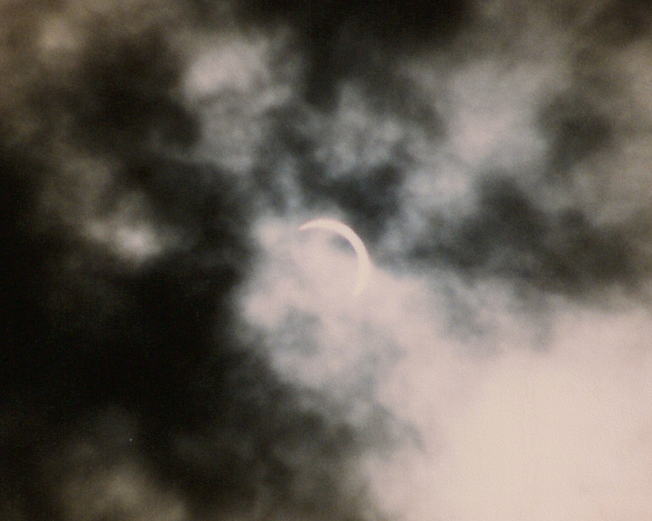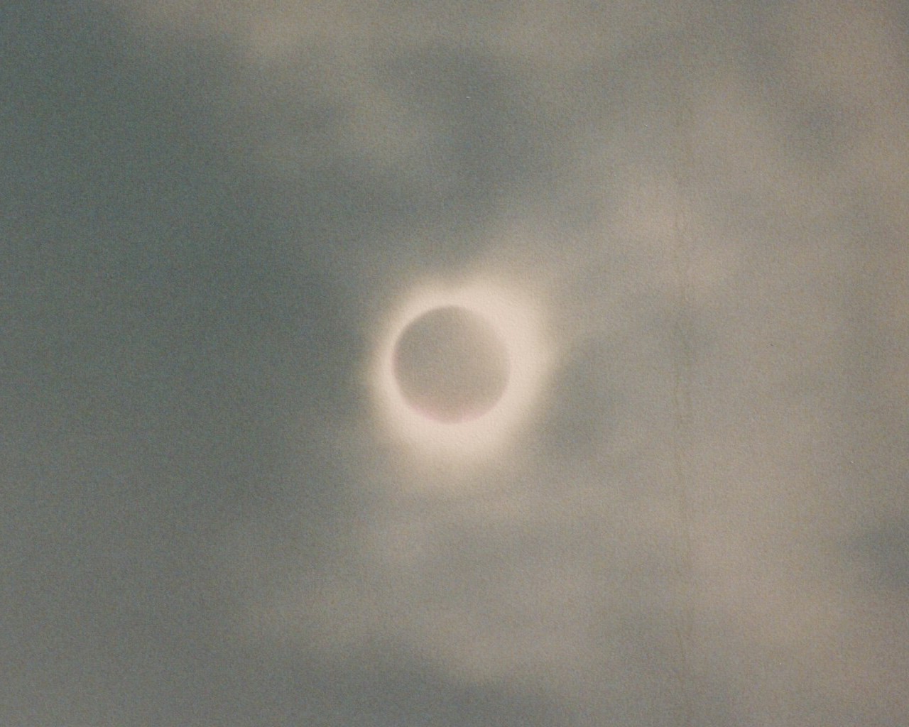Auf den Bildern der partiellen Phase kann man recht gut die Bewölkungssituation erahnen. Es war quasi eine geschlossene Wolkendecke, jedoch teilweise recht dünne Wolken, durch die die Sonne durchschien. Leider weiß ich es nicht mehr, aber ich nehme an, daß ich die Fotos mit automatischer Belichtung gemacht hatte. Als uns die Totalität erreichte, drückte ich noch einmal schnell den Auslöser. Nach ca. 10 Sekunden verschwand die verfinsterte Sonne hinter einer undurchdringlichen Wolke, wo sie für die nächsten 3 oder 4 Minuten blieb. Nachdem die Wolke die Sonne wieder frei gab machte ich noch ein paar Aufnahmen der partiellen Phase und wir machen uns wieder auf den Rückweg nach Koblenz.