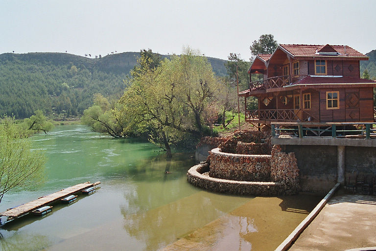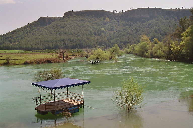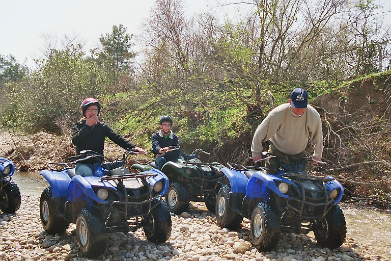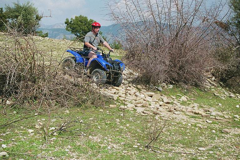 Allerdings ging der Weg von der Mietstation zum Übungsparcour schon durch's Gelände. Und so kam es, daß das nicht ohne Zwischenfall ablief. Der Weg führte an einer Böschung entlang, die in einem Fluß (ich glaube es war der Manavgat - zu dem Zeitpunkt mit Hochwasser) endete. Ich bin etwas zu weit rechts, zu nahe der Böschung gefahren. Ich fuhr mit einem Hinterrad über einen Stein, der unter dem Reifen wegrollte und das gesamte Heck des Quads nach rechts versetzte - ein Rad bereits auf der Böschung. Meine Reaktion auf dieses ungewohnte Verhalten war natürlich zu heftig und damit kontraproduktiv. Ich lenkte gegen (aber zu viel) und gab Gas um wieder auf den Weg zu kommen. Die Aktion führte dazu, daß das gesamte Quad auf die Böschung kam und ich mit samt dem Quad seitlich runter rutschte.