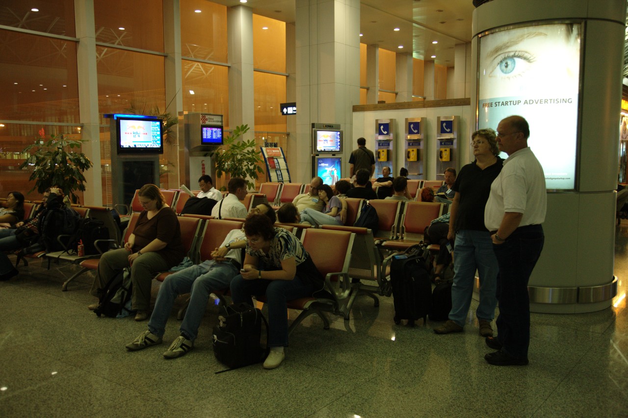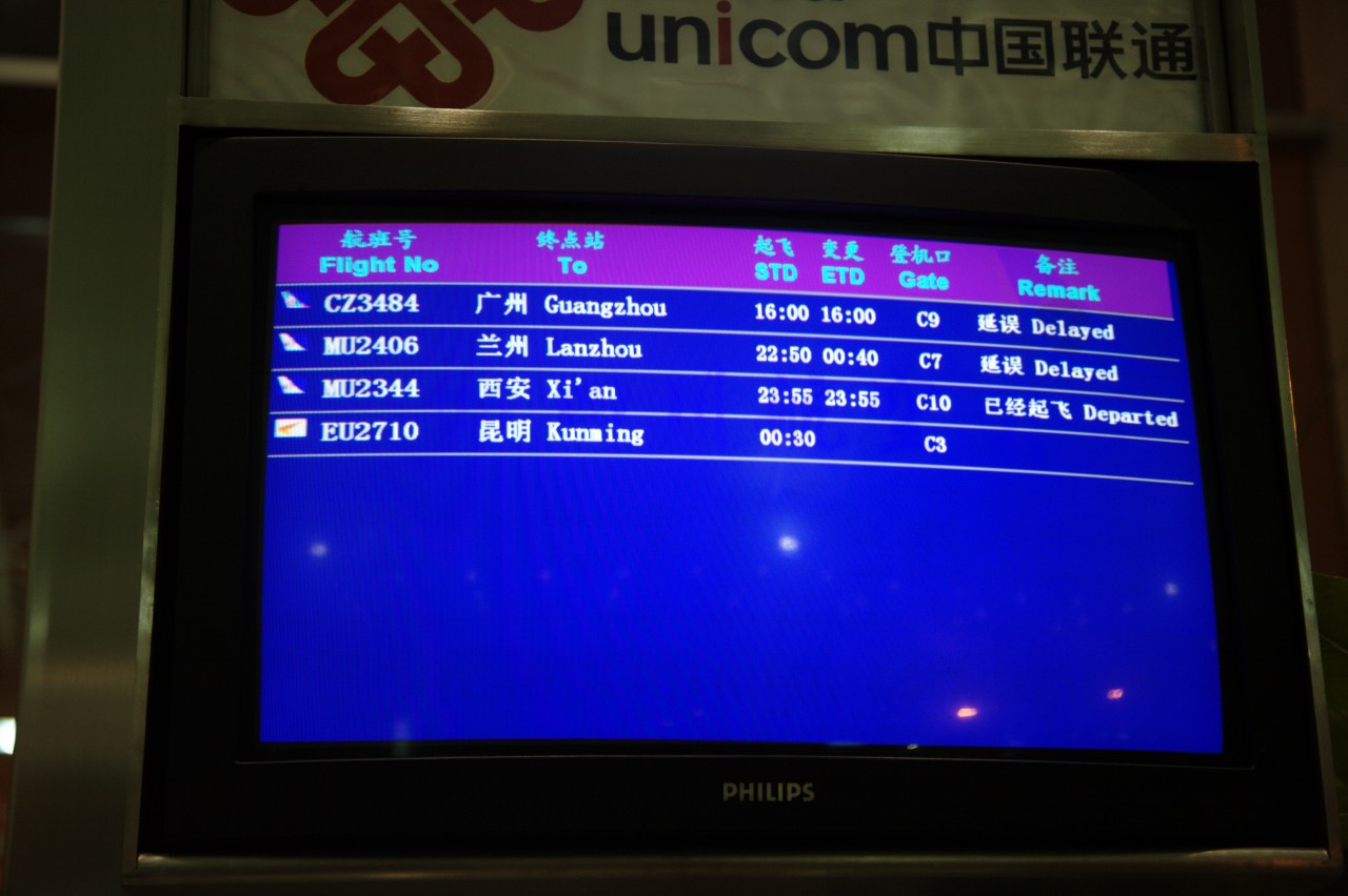 Nach dem reichhaltigen und scharfen Essen - bei dem einige aus unserer Reisegruppe offensichtlich das erste mal in Ihrem Leben Esstäbchen in der Hand hatten - ging es zurück zum Flughafen. Das Boarding verspätete sich um 2 Stunden, da der Flieger wegen schlechter Wetterbedingungen verspätet ankam. Jetzt hatte uns das Gewitter, weswegen der Flieger sich vermutlich verspätet hatte, eingeholt und wir konnten nicht starten. Nach einer weiteren Stunde auf dem Rollfeld hoben wir dann endlich um 2:20 Uhr Ortszeit Richtung Lanzhou ab.