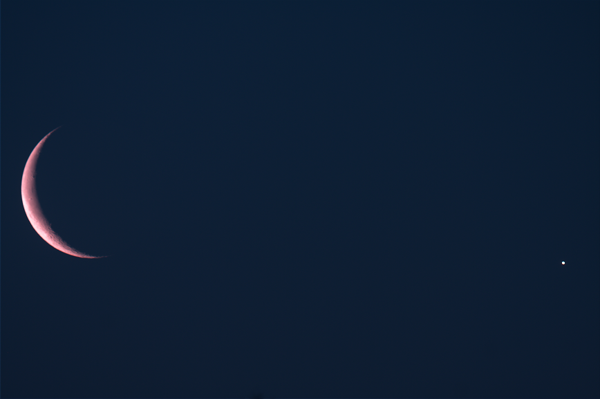 Eine enge Begegnung von Mond und Venus. Das Bildfeld war gerade groß genug, um beide mit der EOS 5D am ED80/600 auf den Chip zu bekommen.